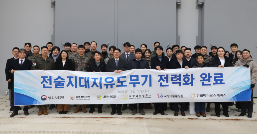 방위사업청장(청장 이용철)은 12월 16일(화) 미사일전략사령부에서 전술지대지유도무기 전력화 완료 행사를 개최했습니다. 이날 행사에는 방위사업청 유도무기사업부장을 비롯해 합참, 육군본부, 국방시설본부, 국방과학연구소, 국방기술품질원, 한화에어로스페이스 관계자들이 참석해 킬체인(Kill-Chain) 핵심 전력인 전술지대지유도무기(KTSSM*) 전력화 완료를 축하했습니다.