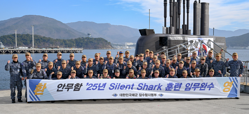 ◦해군은 12월 30일 오전, 진해군항에서 김태훈(소장) 해군잠수함사령관 직무대리 주관으로 한미 연합대잠훈련 ‘2025 사일런트 샤크(Silent Shark)’ 훈련을 마치고 복귀한 안무함 입항 환영식을 진행했다. 이날 행사에는 잠수함사령부 장병 및 안무함 승조원 가족들이 참석해 첫 해외훈련 임무를 성공적으로 완수한 안무함 입항을 축하했다.